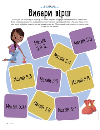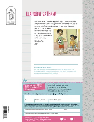 Лютий 2023 Дорогі друзі!Прочитайте послання про доброзичливе ставлення до людей і боротьбу зі цькуванням. Друзі по листуваннюПрочитай кілька листів від наших друзів з усього світу! Рассел М. НельсонЯк отримати радістьПрочитай послання від Президента Рассела М. Нельсона про те, як отримати радість. Рей ГолдрупДванадцять наліпок-смайликівАнтоніо робить людям добро після того як від своєї вчительки Початкового товариства отримав завдання викликати в людей усмішку. За Мною йдіть За Мною йдіть: завданняВикористовуйте ці завдання під час навчання за посібником За Мною йдіть разом із сім’єю. Вибери віршЗіграйте у цікаву гру, пов’язану з Писаннями! ХрищенняДізнайся про свій шлях завітів, щоб повернутися назад до Небесного Батька. Марісса ДеннісВтрачені та знайдені друзіНебесний Батько допоміг Лії, коли її подруга в школі відвернулася від неї. Айзек І.Вибір у футболіАйзек І. розповідає про те, як він зробив вибір святити Суботній день. Знайди це на малюнку!Чи можеш ти знайти на малюнку сховані предмети? Мікаела ВілкінсОтакі великі історіїБекхем говорить трохи неправди і дізнається, що говорити правду—найкращий вибір. Іти за Ісусом у ШвеціїПознайомся з Ліннеєю, Феліцією та Сесілією зі Швеції і дізнайся, як вони йдуть за Ісусом. Привіт зі Швеції!Вирушай у подорож, щоб дізнатися про Швецію! Джеффрі Р. ХолландЧого євангелія навчає про любов?Прочитай послання старійшини Джеффрі Р. Холланда про те, як Бог навчає нас любити. Зроби власну квітку-серцеЗроби поробку з сердечок, щоб комусь подарувати. Гейлі Кінні-КорнеліусДрузі на час перервиДжейсон знаходить друзів у школі, яким подобається те ж саме, що і йому. Я можу заступатися за іншихДізнайся про те, як Ісус Христос захищав інших і виявляв доброту. Наслідувати Ісуса разомПідбірка дитячих висловів з усього світу. Люсі Стівенсон ЮеллЯєчний безладСаша і Альфред вирішили пограти: порозбивали яйця і зробили безлад, але вирішили бути чесними. З’єднай пташокЗіграй у гру “Знайди пару”, щоб згадати, як Ісус Христос дбає про нас. Чудова ідеяПлакат з посланням “Коли я йду за Ісусом Христом, я відчуваю щастя!” Ваянгіна СікагемаЧи є там Бог?Прочитай послання старійшини Ваянгіни Сікагеми про те, як він у дитинстві був запечатаний зі своєю сім’єю в храмі. Марго і ПаолоПаоло хвилюється щодо нового класу Початкового товариства, але Марго допомагає йому заспокоїтися. Для дітей старшого віку Для дітей старшого вікуПоради і завдання для дітей старшого віку. Джуліенн Тенні ДоманПослання щастяРайлі та її друзі зробили щось добре для свого нового вчителя, щоб допомогти йому відчути, що йому раді у школі. Що у тебе на думці?Прочитай про те, як вдячність може допомогти тобі почуватися щасливіше. Пазл-картинкаЗаверши пазл, щоб знайти відповідь на запитання. Цоіла Роса Треллес АраухоНове покликання МаркоМарко покликають стати консультантом з сімейної історії у його приході й він навчається виконувати сімейно-історичну роботу. Те, що найважливішеВиконай це завдання, яке допоможе тобі встановити цілі за програмою для дітей і молоді. Маленьким друзям Маленьким друзямПознайомся з маленькими друзями з усього світу. Я можу йти за Ісусом, вибираючи правильнеДізнайся про те, як ти можеш іти за Ісусом, вибираючи правильне. Ісус зцілює жінкуПрочитай історію про те, як Ісус зцілив жінку. Я маю віру в Ісуса ХристаН
