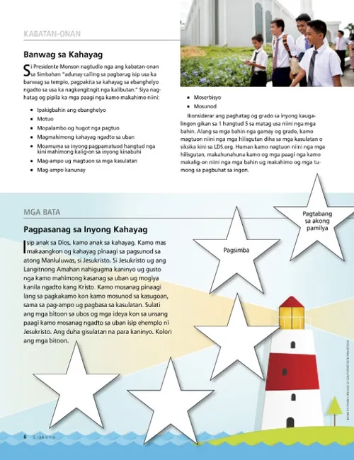 Ang katuigan sa pagkabatan-on dili sayon. Kini ang panahon nga si Satanas motintal kaninyo ug buhaton niya ang tanan sa pagdani kaninyo nga mahilayo sa dalan nga mogiya kaninyo balik sa langitnong panimalay. Apan samtang kamo magbasa ug mag-ampo ug kamo magserbisyo ug mosunod, inyong mas maila ang “kahayag nga nagdan-ag sa kangitngit” (D&P 6:21), atong Ehemplo ug atong kalig-on—gani ang Ginoong Jesukristo. Siya ang Kahayag nga atong ipataas aron mawala ang pagpundok sa kangitngit (tan-awa sa 3 Nephi 18:24).