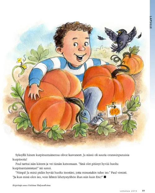 Syksyllä hänen kurpitsantaimensa olivat kasvaneet. Ja niissä oli suuria oranssinpunaisia kurpitsoita!