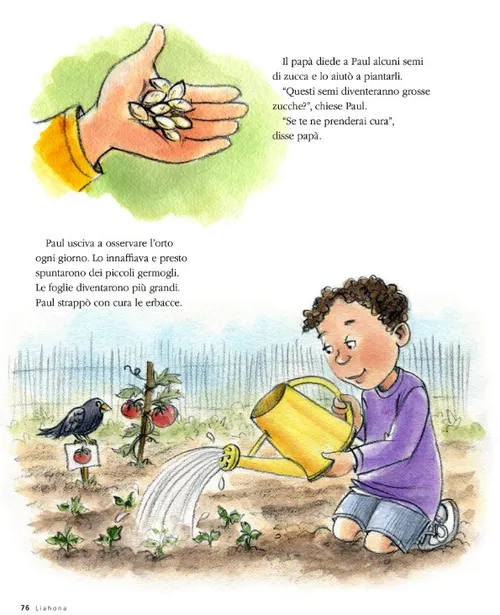 Paul usciva a osservare l’orto ogni giorno. Lo innaffiava e presto spuntarono dei piccoli germogli. Le foglie diventarono più grandi. Paul strappò con cura le erbacce.