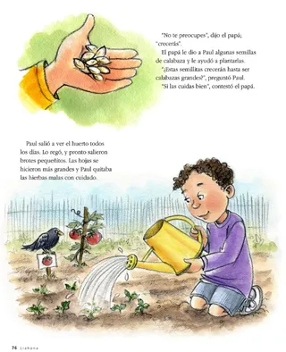 Paul salió a ver el huerto todos los días. Lo regó, y pronto salieron brotes pequeñitos. Las hojas se hicieron más grandes y Paul quitaba las hierbas malas con cuidado.