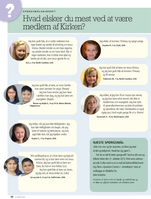 Oktober 2015 Forslag til familieaften Kom i mål, mens faklen endnu er tændt Dieter F. UchtdorfKom i mål, mens faklen endnu er tændt Hold jeres fakkel tændt: 30-dagesprøven Få jeres fakkel til at lyse mere klart Jesu Kristi guddommelige egenskaber: Fyldt med næstekærlighed og kærlighed Brooke BartonGjorde jeg nok? Rachel CoxGræskar eller meloner? Richard E. Turley Jr., Robin S. Jensen, and Mark Ashurst-McGeeSeeren Joseph Norman C. HillOrd, der kan ændre vores verden Carol F. McConkieLær de unge at lede som Frelseren Cynthia CollierFejring af familieaften Robert D. HalesFrelsesplanen: En hellig skat af kundskab til at vejlede os Sidste dages hellige røster Kelly LaingHvor vigtigt kunne det være? Sandy HowsonSøster Spafford talte til mig Amber CheneyJeg vidste ikke, hvorfor jeg var der John K. MuarorJeg bad om at kunne komme til Rotuma Unge voksne Randall L. RiddAt leve med oprigtig hensigt Unge Dallin H. OaksAt komme ud af pornografiens fælde På det rette sted på det rette tidspunkt På det rette sted på det rette tidspunkt Fátima Rocha GutiérrezParkeringsbilletten Chen Ching Chuan En telefonopringning i rette tid Plakat: Dit livs bog 1 Mosebog 1:26-27 Peng HuaMin søgen efter sandhed Gisela GuthierFantastiske unge mænd og unge piger i skrifterne Spørgsmål & svar Børn Marissa WiddisonEn vinderbeslutning Hvad elsker du mest ved at være medlem af Kirken? Vores side Erin SandersonPeter, Cornelius og englen Kimberly ReidFind hjælp Åh nej! Hvad gør jeg? Pauls græskar Ray GoldrupPauls græskar Græskarbedet Jan Pinborough and Michael F. MoodyMillioner stærke børn Henry B. EyringVejen til sikkerhed Linda K. BurtonIndblik