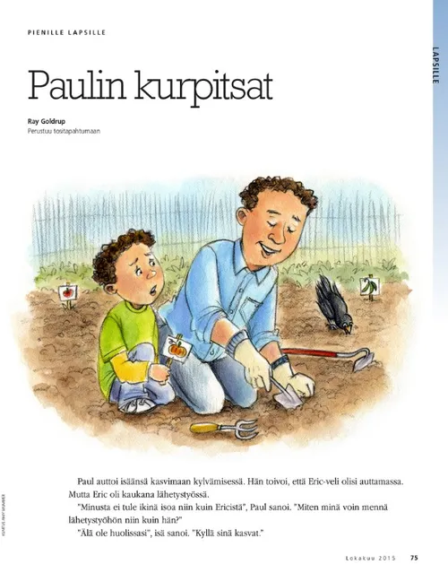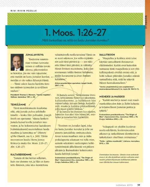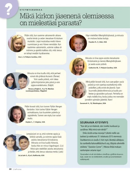 Lokakuu 2015 Perheiltaideoita Maaliin soihtu yhä palaen Dieter F. UchtdorfMaaliin soihtu yhä palaen Anna soihtusi palaa kirkkaana: 30 päivän haaste Anna soihtusi palaa kirkkaammin Jeesuksen Kristuksen jumalallisia ominaisuuksia: täynnä rakkautta Brooke BartonTeinkö tarpeeksi? Rachel CoxKurpitsoja vai meloneita? Richard E. Turley Jr., Robin S. Jensen, and Mark Ashurst-McGeeJoseph, näkijä Norman C. HillSanat, jotka muuttavat maailmamme Carol F. McConkieOpetamme nuoria johtamaan Vapahtajan tavalla Cynthia CollierJuhlimme perheiltaa Robert D. HalesPelastussuunnitelma: pyhä tiedon aarre oppaanamme Myöhempien aikojen pyhien kertomaa Kelly LaingKuinka tärkeää se voisi olla? Sandy HowsonSisar Spafford puhui minulle Amber CheneyEn tiennyt, miksi olin siellä John K. MuarorRukoilin päästäkseni Rotumaan Nuorille aikuisille Randall L. RiddEläkää vakain aikein Nuorille Dallin H. OaksPornografian ansasta pääsee pois Oikeassa paikassa oikeaan aikaan Oikeassa paikassa oikeaan aikaan Fátima Rocha GutiérrezParkkilippu Chen Ching Chuan Puhelinsoitto oikeaan aikaan Juliste: Sinun elämänkirjasi 1. Moos. 1:26–27 Peng HuaEtsin totuutta Gisela GuthierSuurenmoisia nuoria miehiä ja nuoria naisia pyhissä kirjoituksissa Kysymys ja vastaus Lapsille Marissa WiddisonVoittoisa päätös Mikä kirkon jäsenenä olemisessa on mielestäsi parasta? Meidän sivumme Erin SandersonPietari, Cornelius ja enkeli Kimberly ReidApu löytyi Voi ei! Mitä nyt? Paulin kurpitsat Ray GoldrupPaulin kurpitsat Kurpitsamaa Jan Pinborough and Michael F. MoodyKallis on aarre Henry B. EyringTie turvaan Linda K. BurtonPohdintoja