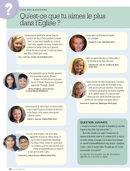 Octobre 2015 Idées de soirée familiale Finissez avec votre flambeau encore allumé Dieter F. UchtdorfFinissez avec votre flambeau encore allumé Alimentez votre flambeau : le test des 30 jours Fais briller davantage ton flambeau Qualités de Jésus-Christ : rempli de charité et d’amour Brooke BartonEst-ce que j’en faisais assez ? Rachel CoxDes citrouilles ou des melons ? Richard E. Turley Jr., Robin S. Jensen, and Mark Ashurst-McGeeJoseph le voyant Norman C. HillDes mots pour changer notre monde Carol F. McConkieEnseigner aux jeunes à diriger à la manière du Sauveur Cynthia CollierCentenaire de la soirée familiale Robert D. HalesLe plan du salut : un trésor sacré de connaissance qui nous guide Les saints des derniers jours nous parlent Kelly LaingQuelle importance cela pouvait-il avoir ? Sandy HowsonSœur Spafford s’adressait à moi Amber CheneyJe ne savais pas pourquoi j’étais là John K. MuarorPrier pour arriver à Rotuma Jeunes adultes Randall L. RiddVivre avec une intention réelle Jeunes Dallin H. OaksSe remettre du piège de la pornographie Au bon endroit, au bon moment Au bon endroit, au bon moment Fátima Rocha GutiérrezLe ticket de parking Chen Ching Chuan Un appel téléphonique providentiel Affiche : Votre livre de vie Genèse 1:26-27 Peng HuaMa quête de la vérité Gisela GuthierJeunes gens et jeunes filles remarquables dans les Écritures Questions et réponses Enfants Marissa WiddisonUne décision gagnante Qu’est-ce que tu aimes le plus dans l’Église ? Notre page Erin SandersonPierre, Corneille et l’ange Kimberly ReidTrouver de l’aide Oh, non ! Que faire maintenant ? Les citrouilles de Paul Ray GoldrupLes citrouilles de Paul Le carré de citrouilles Jan Pinborough and Michael F. MoodyJe suis unique Henry B. EyringLa voie de la sécurité Linda K. BurtonIdées