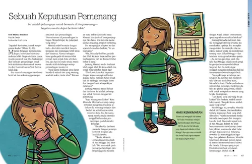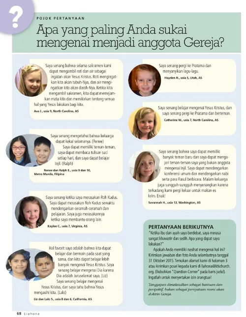 Oktober 2015 Gagasan Malam Keluarga Menyelesaikan dengan Obor Anda Masih Menyala Dieter F. UchtdorfMenyelesaikan dengan Obor Anda Masih Menyala Isi Bahan Bakar Obor Anda: Percobaan 30 Hari Jadikan Obor Anda Lebih Terang Sifat-Sifat Ilahi Yesus Kristus: Dipenuhi dengan Kasih Amal dan Kasih Brooke BartonSudah Cukupkah Saya Melakukan? Rachel CoxLabu atau Melon? Richard E. Turley Jr., Robin S. Jensen, and Mark Ashurst-McGeeJoseph Sang Pelihat Norman C. HillKata-Kata untuk Mengubah Dunia Kita Carol F. McConkieMengajar Remaja Bagaimana Memimpin dengan Cara Juruselamat Cynthia CollierMerayakan Malam Keluarga Robert D. HalesRencana Keselamatan: Harta Sakral Akan Pengetahuan untuk Membimbing Kita Suara Orang Suci Zaman Akhir Kelly LaingSeberapa Pentingkah Ini? Sandy HowsonSister Spafford Berbicara kepada Saya Amber CheneySaya Tidak Tahu Mengapa Saya Ada di Sana John K. MuarorBerdoa untuk Perjalanan Saya ke Rotuma Dewasa Muda Randall L. RiddHidup dengan Maksud yang Sungguh-Sungguh Remaja Dallin H. OaksPulih dari Jerat Pornografi Di Tempat yang Benar pada Saat yang Tepat Di Tempat yang Benar pada Saat yang Tepat Fátima Rocha GutiérrezTiket Parkir Chen Ching Chuan Panggilan Telepon Tepat Waktu Poster: Kitab Kehidupan Anda Kejadian 1:26–27 Peng HuaPencarian Saya Akan Kebenaran Gisela GuthierRemaja Putra dan Remaja Putri yang Menakjubkan dalam Tulisan Suci Tanya & Jawab Anak-anak Marissa WiddisonSebuah Keputusan Pemenang Apa yang Anda paling Anda sukai mengenai menjadi anggota Gereja? Halaman Kita Erin SandersonPetrus, Kornelius, dan Malaikat Kimberly ReidMenemukan Bantuan Ah tidak! Sekarang bagaimana? Labu Paul Ray GoldrupLabu Paul Tambalan Labu Jan Pinborough and Michael F. MoodySatu dalam Sejuta Henry B. EyringJalan Menuju Keselamatan Linda K. BurtonWawasan