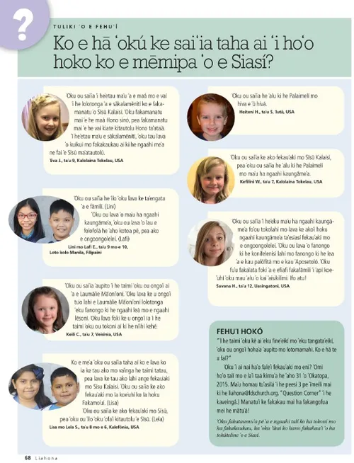 ʻOkatopa 2015 Ngaahi Fakakaukau Maʻá e Efiafi Fakafāmili ʻi ʻApí Ikuna Kae Kei Ulo Pē Hoʻo Amá Dieter F. UchtdorfIkuna Kae Kei Ulo Pē Hoʻo Amá Toloaki Hoʻo Amá: Polokalama ʻAhiʻahi ʻAho ʻe 30 ʻAi Hoʻo Amá ke Ulo Lahi Ange Ngaahi ʻUlungaanga Fakalangi ʻo Sīsū Kalaisí—Fonu ʻi he Manavaʻofa mo e ʻOfa Brooke BartonNe Feʻunga nai ʻEku Ngāué? Rachel CoxHiná pe Melení? Richard E. Turley Jr., Robin S. Jensen, and Mark Ashurst-McGeeSiosefa ko e Tangata Kikité Norman C. HillNgaahi Lea ke Liliu Hotau Māmaní Carol F. McConkieKo Hono Akoʻi e Toʻu Tupú ke Taki ʻi he Founga ʻa e Fakamoʻuí Cynthia CollierFakamanatua ʻo e Efiafi Fakafāmili ʻi ʻApí Robert D. HalesKo e Palani ʻo e Fakamoʻuí: Ko ha Mataʻikoloa Toputapu ʻo e ʻIló ke Tataki Kitautolu Leʻo ʻo e Kau Māʻoniʻoni ʻi he Ngaahi ʻAho Kimui Ní Kelly LaingʻOku Mahuʻinga Fēfē Nai ʻEni? Sandy HowsonNaʻe lea mai ʻa Sisitā Sipāfooti kiate Au Amber CheneyNaʻe ʻIkai Ke u ʻIlo e ʻUhinga ʻEku ʻI aí John K. MuarorKo e Lotua Hoku Hala ki Lotumá Kakai Lalahi Kei Talavoú Randall L. RiddMoʻui ʻi he Loto Moʻoni Toʻu Tupú Dallin H. OaksKo e Fakaakeake mei he Tauhele ʻo e Ponokalafí ʻI he Feituʻu Totonu he Taimi Totonu ʻI he Feituʻu Totonu he Taimi Totonu Fátima Rocha GutiérrezKo e Tikite Tauʻanga Meʻalelé Chen Ching Chuan Ko Ha Telefoni Taimi Tonu Pousitā: Ko Hoʻo Tohi ʻo e Moʻuí Sēnesi 1:26–27 Peng HuaKo ʻEku Fekumi ki he Moʻoní Gisela GuthierKau Talavou mo e Kau Finemui Maʻongoʻonga ʻi he folofolá Ngaahi Fehuʻi mo e Talí Fānaú Marissa WiddisonKo ha Fili Ikuna Ko e hā ʻokú ke saiʻia taha ai ʻi hoʻo hoko ko e mēmipa ʻo e Siasí? Ko ʻEtau Pēsí Erin SandersonKo Pita, Koniliusi, mo e ʻĀngeló Kimberly ReidKo e Kumi Tokoní ʻOiauē! Ko e Hā Leva he Taimi ní? Ko e Hina ʻa Paulá Ray GoldrupKo e Hina ʻa Paulá Ngaahi Foʻi Pupunga Hiná Jan Pinborough and Michael F. MoodyTaha he Milioná Henry B. EyringKo e Hala ki he Maluʻangá Linda K. BurtonNgaahi ʻIlo