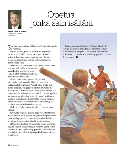 Yhtenä sunnuntaina kysyin isältä, milloin hän aikoi mennä kasteelle. Hän vain hymyili ja esitti minulle kysymyksen. ”David, eikös teidän kirkkonne opetakin, että pappeus otettiin muinoin pois maan päältä ja että taivaalliset sanansaattajat ovat palauttaneet sen? Jos kirkossanne on todellakin Jumalan palautettu pappeus, niin miksi sitten niin monet kirkkoonne kuuluvat miehet eivät ole mitenkään erilaisia pappeusvelvollisuuksiensa hoitamisessa kuin ne miehet, jotka kuuluvat samaan kirkkoon kuin minä?”