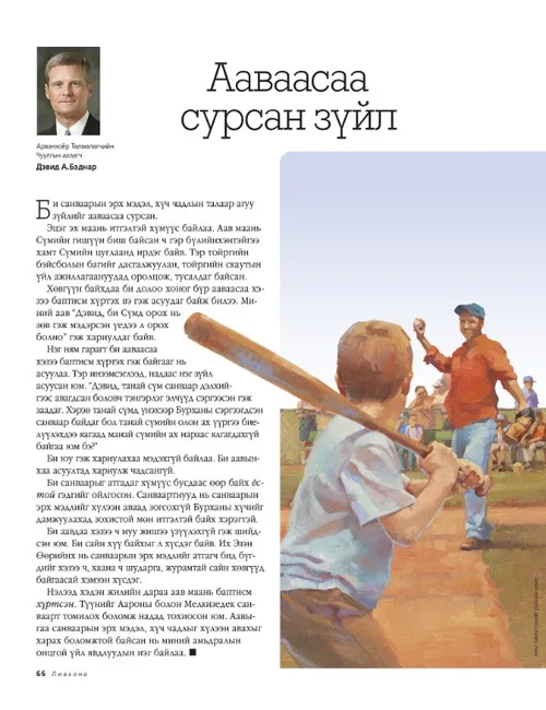 Нэг ням гарагт би ааваасаа хэзээ баптисм хүртэх гэж байгааг нь асуулаа. Тэр инээмсэглээд, надаас нэг зүйл асуусан юм. “Дэвид, танай сүм санваар дэлхийгээс авагдсан боловч тэнгэрлэг элчүүд сэргээсэн гэж заадаг. Хэрэв танай сүмд үнэхээр Бурханы сэргээгдсэн санваар байдаг бол танай сүмийн олон ах үүргээ биелүүлэхдээ яагаад манай сүмийн ах нараас ялгагдахгүй байгаа юм бэ?”
