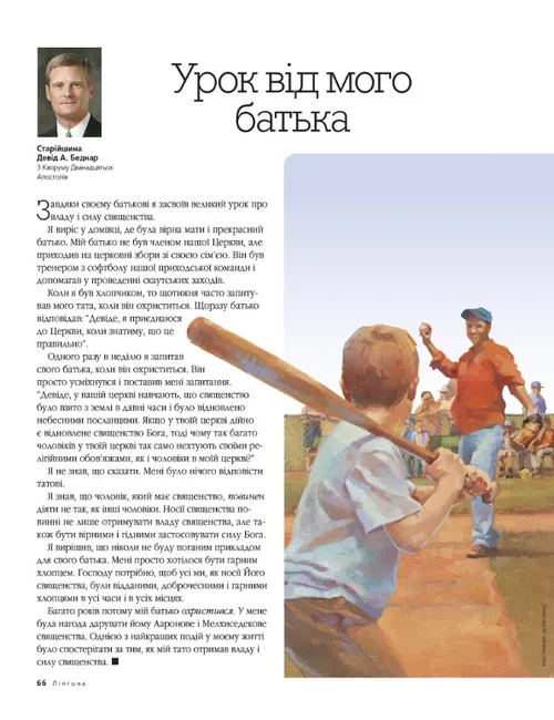 Одного разу в неділю я запитав свого батька, коли він охриститься. Він просто усміхнувся і поставив мені запитання. “Девіде, у вашій церкві навчають, що священство було взято з землі в давні часи і було відновлено небесними посланцями. Якщо у твоїй церкві дійно є відновлене священство Бога, тоді чому так багато чоловіків у твоїй церкві так само нехтують своїми релігійними обов’язками, як і чоловіки в моїй церкві?”