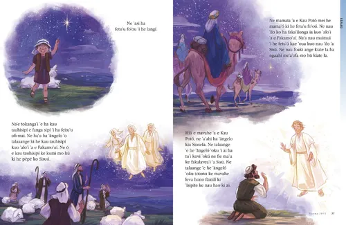 Naʻe tokangaʻi ʻe ha kau tauhisipi e fanga sipí ʻi ha feituʻu ofi mai. Ne haʻu ha ʻāngelo ʻo talaaange ki he kau tauhisipí kuo ʻaloʻi ʻa e Fakamoʻuí. Ne ō e kau tauhisipí ke kumi mo hū ki he pēpē ko Sīsuú.