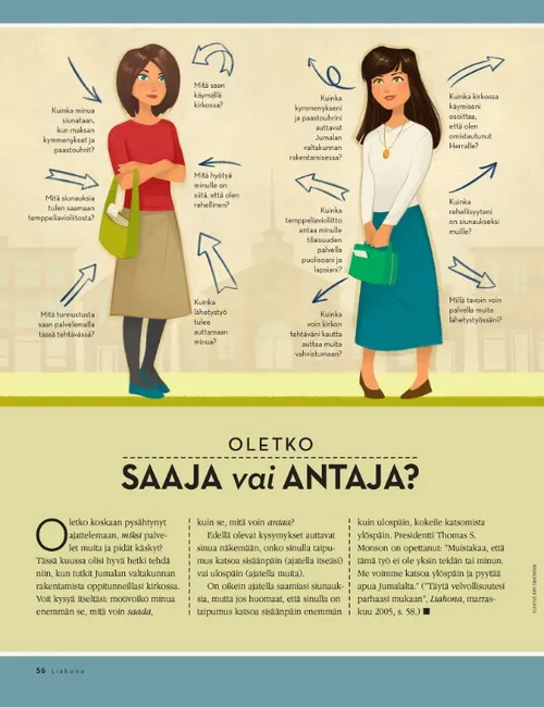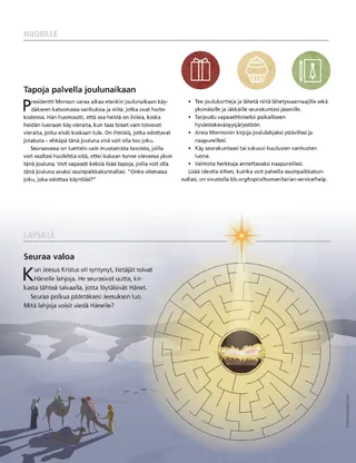 Joulukuu 2015 Perheiltaideoita Varaa aikaa Vapahtajalle Thomas S. MonsonVaraa aikaa Vapahtajalle Tapoja palvella joulunaikaan Seuraa valoa Jeesuksen Kristuksen jumalallisia ominaisuuksia: myötätunto ja lempeys Brad AllredElämän ja rakkauden lahja Boyd K. PackerTodistus Vapahtajasta Jeesuksesta Kristuksesta David A. EdwardsJoseph Smith ja Johanneksen ilmestys Scott H. KnechtEsitä oikeita kysymyksiä oikealla tavalla Marcus B. NashUusi ja ikuinen liitto Néstor Curbelo”Annoin sitoumuksen Jumalalle” D. Todd ChristoffersonOlkaa rauhassa Myöhempien aikojen pyhien kertomaa Antonella TrevisanJuosten temppeliin Joan Burton StottMinun jouluihmeeni Candice A. GroverUhrinauhat Robert HoffmanEn ollut yksin Stephanie H. OlsenNykyajan lesken ropo Hannah EiselinMistä he tiesivät tarpeeni? Nuorille aikuisille Brittany Romanello CascoPalasin lähetystyöstäni kotiin etuajassa Justina McCandlessTodistajana Saksassa Nuorille President Dieter F. UchtdorfKuinka voi nähdä joulun todellisen merkityksen Keanu WilliamsElämää muuttanut lahja kirpputorilta Matthew FlittonUusi kaveri He tunsivat Josephin Oletko saaja vai antaja? Juliste: Käytä sitä tai menetät sen Tunnen riittämättömyyttä Nuorten Naisten luokan johtajana. Kuinka voin olla parempi johtaja? Elder Jörg KlebingatAsioita, joita opin nuorena käännynnäisenä Raisa MarcondesEdistyminen sukupuussani Lapsille Marcus B. NashPyhien kirjoitusten merkitys Spencerille David A. BednarOpetus, jonka sain isältäni Pyhien kirjoitusten leikekuvia Honney Thalia Cabel LosnoJouluaatto Córdoban perheen seurassa Heidi PoelmanPalapeli palautuksesta Erin SandersonJeesus Kristus tulee jälleen! Joulukertomus President Howard W. HunterTodellinen joulu Russell M. NelsonNäkemyksiä
