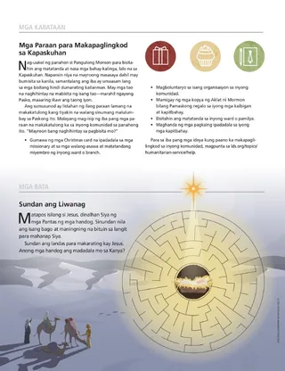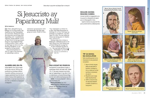 Disyembre 2015 Mga Ideya para sa Family Home Evening Maglaan ng Oras para sa Tagapagligtas Thomas S. MonsonMaglaan ng Oras para sa Tagapagligtas Mga Paraan para Makapaglingkod sa Kapaskuhan Sundan ang Liwanag Mga Banal na Katangian ni Jesucristo: Mahabagin at Mabait Brad AllredIsang Handog na Buhay at Pagmamahal Boyd K. PackerIsang Saksi ng Tagapagligtas na si Jesucristo David A. EdwardsSi Joseph Smith at ang Aklat ng Apocalipsis Scott H. KnechtTamang Pagtatanong sa Tamang Paraan Marcus B. NashAng Bago at Walang-Hanggang Tipan Néstor Curbelo“Ako’y Nangako sa Diyos” D. Todd ChristoffersonMaging Payapa Mga Tinig ng mga Banal sa mga Huling Araw Antonella TrevisanTumatakbong Patungo sa Templo Joan Burton StottAng Himalang Handog sa Akin sa Araw ng Pasko Candice A. GroverMga Tali ng Sakripisyo Robert HoffmanHindi Ako Nag-iisa Stephanie H. OlsenAng Lepta ng Balo sa Panahon Ngayon Hannah EiselinPaano Nila Nalaman ang Kailangan Ko? Mga Young Adult Brittany Romanello CascoNapaagang Pag-uwi mula sa Misyon Justina McCandlessNamumuhay Bilang Isang Saksi sa Germany Mga Kabataan President Dieter F. UchtdorfPaano Makikita ang Tunay na Kahulugan ng Pasko Keanu WilliamsIsang Regalong Nagpapabago ng Buhay sa Thrift Store Matthew FlittonAng Bagong Lipat na Lalaki Kilala Nila si Joseph Tagatanggap Ka Ba o Tagabigay? Poster: Gamitin Ito o Mawawala Ito sa Iyo Pakiramdam ko ay hindi sapat ang kakayahan ko na maging Young Women class president. Paano ako magiging mas mahusay na lider? Elder Jörg KlebingatMga Bagay na Natutuhan Ko Bilang Isang Kabataang Nabinyagan Raisa MarcondesPansariling Pag-unlad sa Aking Family Tree Mga Bata Marcus B. NashMga Banal na Kasulatan para kay Spencer David A. BednarIsang Aral mula sa Aking Ama Mga Larawang May Kaugnayan sa Banal na Kasulatan Honney Thalia Cabel LosnoBisperas ng Pasko Kasama ang mga Córdoba Heidi PoelmanAng Puzzle ng Panunumbalik Erin SandersonSi Jesucristo ay Paparitong Muli! Ang Kuwento ng Pagsilang ni Cristo President Howard W. HunterAng Tunay na Pasko Russell M. NelsonMga Kabatiran