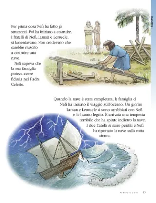 Il viaggio, però, non era ancora finito. Il Padre Celeste ha comandato a Nefi di costruire una nave. Gli ha fatto vedere come doveva essere. Gli ha promesso che la nave li avrebbe portati in un nuovo, bellissimo paese.