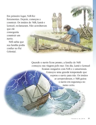 Mas sua jornada não estava terminada. O Pai Celestial mandou Néfi construir um navio. Mostrou a Néfi como devia ser o navio. Prometeu que o navio os levaria a uma maravilhosa terra nova.