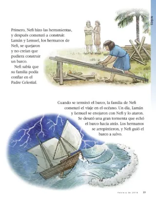 Cuando se terminó el barco, la familia de Nefi comenzó el viaje en el océano. Un día, Lamán y Lemuel se enojaron con Nefi y lo ataron. Se desató una gran tormenta que echó el barco hacia atrás. Los hermanos se arrepintieron, y Nefi guió el barco a salvo.