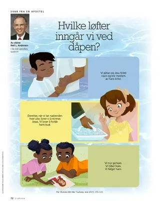 Svar fra en apostel Hvilke løfter inngår vi ved dåpen? Av eldste Neil L. Andersen i De tolv apostlers quorum Fra “Komme ditt rike,” Liahona, mai 2015, 119–123. Vi påtar oss Jesu Kristi navn og blir medlem av hans kirke. Deretter, når vi tar nadverden hver uke, lover vi å minnes Jesus. Vi lover å holde hans bud. Vi tror på ham. Vi tilber ham. Vi følger ham.