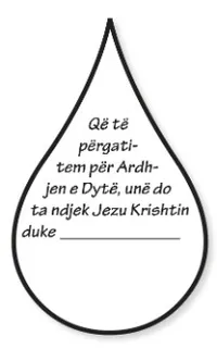 Nxitni zbatimin: Vizatoni në tabelë një llambë. Diskutoni se si ngjason vajtja pas Jezu Krishtit duke bërë të mira çdo ditë, me mbushjen me vaj të llambave tona. Vërini fëmijët të përmendin disa mënyra se si mund të shkojmë pas Jezu Krishtit, siç janë shërbimi ndaj të tjerëve, pagimi i së dhjetës dhe lutja. Shpjegoni se këto janë gjëra që ata duhet t’i bëjnë vetë; njerëz të tjerë nuk mund t’i bëjnë këto gjëra për ta. Jepini secilit fëmijë një fletë letër të prerë sipas një forme të zmadhuar të pikës së vajit. Kërkojuni atyre (ose mësueseve të tyre) të shkruajnë në fletë: “Që të përgatitem për Ardhjen e Dytë, unë do ta ndjek Jezu Krishtin duke ”. Kërkojuni fëmijëve të plotësojnë pjesën e lënë bosh ose të vizatojnë një figurë të diçkaje që mund të bëjnë për t’u përgatitur për Ardhjen e Dytë. Nxitini fëmijët që t’i marrin fletët me vete në shtëpi dhe t’u tregojnë familjeve të tyre se çfarë kanë mësuar.