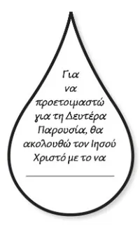 Ενθαρρύνετε την εφαρμογή: Σχεδιάστε ένα λυχνάρι στον πίνακα. Συζητήστε πώς ακολουθώντας τον Ιησού Χριστό με το να κάνουμε καλά πράγματα κάθε μέρα, είναι σαν να βάζουμε λάδι στα λυχνάρια μας. Βάλτε τα παιδιά να ονομάσουν μερικούς τρόπους με τους οποίους μπορούμε να ακολουθήσουμε τον Ιησού Χριστό, όπως υπηρετώντας τους άλλους, πληρώνοντας δέκατα και προσευχόμενοι. Εξηγήστε ότι αυτά είναι πράγματα που πρέπει να κάνουν ατομικά. Οι άλλοι άνθρωποι δεν μπορούν να κάνουν αυτά για εκείνους. Δώστε σε κάθε παιδί ένα κομμάτι χαρτί κομμένο σε σχήμα μεγάλης σταγόνας λαδιού. Ζητήστε τους (ή τις δασκάλες τους) να γράψουν: «Για να προετοιμαστώ για τη Δευτέρα Παρουσία θα ακολουθώ τον Ιησού Χριστό, με το να » στα χαρτιά τους. Ζητήστε από τα παιδιά να γεμίσουν το κενό ή να σχεδιάσουν μια απεικόνιση ή κάτι που μπορούν να κάνουν για να προετοιμαστούν για τη Δευτέρα Παρουσία. Παροτρύνετε τα παιδιά να πάρουν σπίτι τα χαρτιά τους και να πουν αυτά που έμαθαν στην οικογένειά τους.