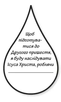 Допоможіть застосувати вчення: Намалюйте на дошці каганець. Обговоріть, як наслідування Ісуса Христа шляхом щоденних добрих вчинків схоже на доливання оливи у наші каганці. Нехай діти назвуть кілька способів наслідування Ісуса Христа, зокрема, служіння іншим, сплата десятини та молитва. Поясніть, що є справи, які вони повинні робити самостійно; інші люди не можуть зробити цього за них. Дайте кожній дитині папірець, вирізаний у формі великої краплі олії. Попросіть їх (або їхніх учителів) написати на цих папірцях: “Щоб підготуватися до Другого пришестя, я буду наслідувати Ісуса Христа, роблячи ”. Попросіть дітей дописати речення або зробити малюнок того, як саме вони можуть підготуватися до Другого пришестя. Запропонуйте дітям взяти ці “крапельки” додому й поділитися зі своїми сім’ями тим, про що вони дізналися.