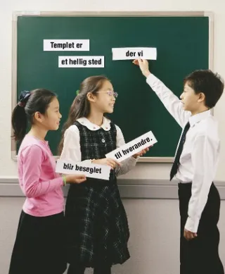 Introduser læresetningen: Be et eldre barn lese de to siste setningene i 3. avsnitt av «Familien – En erklæring til verden» for hele Primær. Skriv hvert av følgende ord og uttrykk på separate papirstrimler: Templet er, et hellig sted, der vi, blir beseglet, til hverandre. Plasser dem på tavlen i tilfeldig rekkefølge. La et barn sette én strimmel på riktig sted. Fortsett til ordene står riktig. Syng annet vers av «Jeg ser vår Herres tempel», og la halvparten av barna lytte etter to ting vi gjør i templet (inngår pakter og lover å være lydige) og den andre halvparten lytte etter en sannhet de har lært (en familie er evig). Hjelp barna å forstå at å bli beseglet til sin familie i templet betyr at de kan være sammen for evig.