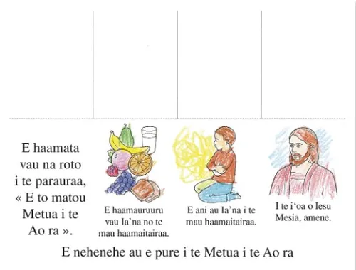 A faaite i te haapiiraa tumu : A ani i te hoê tamarii e i te hoê o to’na metua ia haere mai i mua i te mau tamarii. A ani i te tamarii ia ui i to’na metua i te hoê uiraa, e ia pahono te metua. I muri iho a ani i te metua ia haere atu i rapae i te piha e ia tapiri i te opani. A ani i te mau tamarii e nahea ratou ia aparau i to ratou metua aita ana‘e to ratou metua i piha‘iho ia ratou (ei hi‘oraa, papa‘iraa i te hoê rata o aore râ te paraparauraa no roto i te niuniu). A faataa e o te Atua to tatou Metua e o tatou Ta’na mau tamarii ; no te mea e aita tatou i mua i To’na aro, ua horo‘a mai Oia ia tatou i te hoê rave‘a no te paraparau Ia’na. A ani i te mau tamarii mai te mea ua ite ratou e nahea tatou ia paraparau i te Atua. A ani i te mau tamarii ia parau na muri iho ia outou, « e nehenehe au e pure i te Metua i te Ao ra »