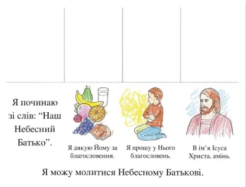 Допоможіть зрозуміти вчення: Поділіться з дітьми “живим” віршем на с. 16 посібника для ясельної групи Дивіться на своїх маленьких. Зробіть для кожної дитини копію “перекидної книги” на с. 19 посібника для ясельної групи Дивіться на своїх маленьких. Запропонуйте дітям розмалювати картинки. (Старші діти можуть написати на паперових смужках те, за що вони вдячні і про що можуть просити Небесного Батька. Тоді ви можете запропонувати їм поділитися своїми ідеями з усім Початковим товариством).