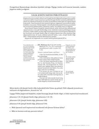 Kas te teate, kust peale Kallihinnalise Pärli veel Joseph Smithi piiblitõlkeid leida? Paljud neist asuvad pühakirjade lõpus olevates väljavõtetes Joseph Smithi piiblitõlkest või Joseph Smithi tõlke lisas, mis asub Evangeeliumi Raamatukogu rakenduse õpiabide rubriigis. Õppige, kuidas neid ressursse kasutada, vaadates järgnevat näidet ja selgitust.