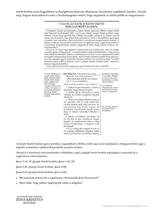 A következő tevékenység segíthet a tanulóknak jobban megérteni a vastagon szedett tantételt, és megismerni a Joseph Smith-fordítást. Kioszthatod A Joseph Smith-fordítás című kiosztmányt. Kérd meg a tanulókat, hogy válasszanak ki egy vagy több szakaszt, amelyet önállóan tanulmányozhatnak, és készüljenek fel a tanultak megtanítására az osztálytársaiknak. Miközben a tanulók tanulmányoznak, emlékeztesd őket, hogy a tanulmányozási naplójukba készített rajz köré írjanak le jelentőségteljes meglátásokat vagy annak az okait, hogy miért hálásak a Joseph Smith-fordításért.