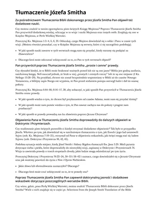 Poniższe ćwiczenie może pomóc uczniom w lepszym zrozumieniu powyższej zasady zapisanej pogrubioną czcionką oraz poznaniu Tłumaczenia Józefa Smitha. Możesz rozdać ulotki zatytułowane „Tłumaczenie Józefa Smitha”. Poproś uczniów, aby wybrali jedną lub kilka części do samodzielnego studiowania i przygotowali się do nauczania swoich kolegów z klasy tego, czego się nauczyli. Podczas studiowania przypomnij im, aby istotne przemyślenia lub powody, dla których są wdzięczni za Tłumaczenie Józefa Smitha, zapisywali wokół rysunku, który utworzyli w dziennikach do studiowania.