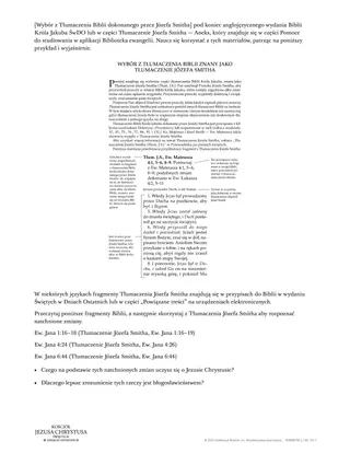 Jedna z prawd, jakie Pan przekazał w tych wersetach, brzmi: Za pośrednictwem Tłumaczenia Biblii dokonanego przez Józefa Smitha Jezus Chrystus objawił dodatkowe prawdy, by pomóc w doprowadzeniu nas do zbawienia. Aby pomóc uczniom w udzieleniu odpowiedzi na to drugie pytanie, warto przekazać im poniższe informacje.