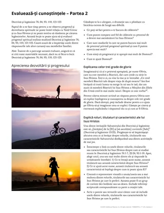 Dacă membrii clasei trebuie să facă o evaluare pentru prima jumătate a cursului, oferiți-le foaia de prezentare intitulată „Evaluează-ți cunoștințele – Partea 1”. Dacă membrii clasei trebuie să facă o evaluare pentru a doua jumătate a cursului, oferiți-le foaia de prezentare intitulată „Evaluează-ți cunoștințele – Partea 2”. Încurajați cursanții să îndeplinească cerințele privind cititul înainte de a parcurge evaluarea. Ei trebuie să vă raporteze când au finalizat această evaluare. Când ei fac acest lucru, invitați-i să împărtășească ce au învățat din această experiență.