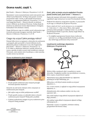 Doktryna i Przymierza. Podręcznik dla nauczyciela seminarium Strona tytułowa Wprowadzenie do publikacji pt. „Doktryna i Przymierza. Podręcznik dla nauczyciela seminarium”Wprowadzenie ułatwiające nauczycielom korzystanie z publikacji Doktryna i Przymierza. Podręcznik dla nauczyciela seminarium Lekcje na podstawie Doktryny i Przymierzy Proklamacja o Przywróceniu Proklamacja o Przywróceniu: ZarysPrzywrócenie ewangelii Jezusa Chrystusa jest trwającą, ważną częścią dni ostatnich. Lekcja 1.: Wielkie OdstępstwoLekcja ta wyjaśnia Wielkie Odstępstwo i może pomóc uczniom zrozumieć potrzebę przywrócenia prawdziwego Kościoła Jezusa Chrystusa w dniach ostatnich. Lekcja 2.: „Przywrócenie pełni ewangelii Jezusa Chrystusa. Proklamacja dla świata z okazji dwusetlecia”Niniejsza lekcja omawia proklamację o Przywróceniu i może pomóc uczniom poczuć prawdziwość i znaczenie trwającego Przywrócenia ewangelii Jezusa Chrystusa. Lekcja 3.: Wprowadzenie do Doktryny i PrzymierzyLekcja ta może pomóc uczniom przygotować się do lepszego poznania Zbawiciela na początku studiowania przez nich Doktryny i Przymierzy. Doktryna i Przymierza 1 Doktryna i Przymierza 1: ZarysBóg ostrzega Swoje dzieci poprzez proroków i pisma święte. Lekcja 4.: Doktryna i Przymierza 1Pan ostrzega świat poprzez Swoich proroków i apostołów. Lekcja 5.: Doktryna i Przymierza 1:30–33Celem tej lekcji jest pomóc uczniom poczuć, jak ważne jest to, że Kościół Jezusa Chrystusa Świętych w Dniach Ostatnich jest jedynym prawdziwym Kościołem. Lekcja 6.: Doktryna i Przymierza 1:37–38Lekcja ta może pomóc uczniom studiować słowa Pana przekazane za pomocą pism świętych i słów współczesnych proroków. Józef Smith — Historia 1:1–26 Józef Smith — Historia 1:1–26: ZarysBóg i Jezus Chrystus ukazują się Józefowi Smithowi. Lekcja 7.: Józef Smith — Historia 1:1–14Niniejsza lekcja omawia kwestię poszukiwania prawdy przez Józefa Smitha i może pomóc uczniom w ich wysiłkach zmierzających do uczenia się prawdy od Boga. Lekcja 8.: Józef Smith Smith — Historia 1:15–20Lekcja ta może pomóc uczniom zrozumieć ważne prawdy o Ojcu Niebieskim i Jezusie Chrystusie pochodzące z Pierwszej Wizji Józefa Smitha. Lekcja 9.: Józef Smith — Historia 1:21–26Ta lekcja może dać uczniom możliwość odczucia tego, jak Duch Święty świadczy im o tym, że Ojciec Niebieski i Jezus Chrystus ukazali się Prorokowi Józefowi Smithowi. Doktryna i Przymierza 2; Józef Smith — Historia 1:27–65 Doktryna i Przymierza 2; Józef Smith — Historia 1:27–65: ZarysAnioł Moroni ukazuje się Józefowi Smithowi. Lekcja 10.: Józef Smith — Historia 1:27–50Ta lekcja może pomóc uczniom poczuć, jak ważne jest znaczenie powołania Józefa Smitha na proroka Boga. Lekcja 11.: Józef Smith — Historia 1:50–65Niniejsza lekcja może pomóc uczniom zrozumieć, że Pan pomoże nam wykonać pracę, którą przykazał nam wykonać. Lekcja 12.: Doktryna i Przymierza 2Zgodnie z proroctwem w tych ostatnich dniach nasze serca zwracają się ku naszym przodkom poprzez pracę świątynną i pracę nad historią rodziny. Doktryna i Przymierza 3–5 Doktryna i Przymierza 3–5: ZarysUfaj Bogu bardziej niż człowiekowi. Lekcja 13.: Doktryna i Przymierza 3Ta lekcja może pomóc uczniom poczuć większe pragnienie, aby ufać Bogu bardziej niż innym ludziom. Lekcja 14.: Doktryna i Przymierza 4Ta lekcja może pomóc uczniom w służeniu Bogu i bliźnim na sposób Chrystusowy. Lekcja 15.: Doktryna i Przymierza 5Ta lekcja może pomóc uczniom w rozpoznaniu świadectw, które daje im Pan, aby pomóc im zdobyć osobiste świadectwo o Księdze Mormona i powołaniu Józefa Smitha. Lekcja 16.: Ocena nauki, część 1.Rozważanie i ocena naszego duchowego uczenia się może pomóc nam zbliżyć się do Zbawiciela. Doktryna i Przymierza 6–9 Doktryna i Przymierza 6–9: ZarysOliver Cowdery przeprowadza się do Pensylwanii, aby pomóc Józefowi Smithowi w tłumaczeniu Księgi Mormona. Lekcja 17.: Doktryna i Przymierza 6Ta lekcja ma na celu pomóc uczniom pokładać ufność w Zbawicielu, gdy będą mieli wątpliwości i obawy. Lekcja 18.: Tłumaczenie Księgi MormonaKsięga Mormona została przetłumaczona darem i mocą Boga. Lekcja 19.: Doktryna i Przymierza 8Oliver Cowdery był pod wrażeniem zdolności tłumaczenia Księgi Mormona u Józefa Smitha. Lekcja 20.: Ćwiczenie z zastosowaniem w praktyce doktryn do opanowania, część 1.Doktryny do opanowania mogą przyczynić się do tego, że uczniowie będą budować swe życie na fundamencie Jezusa Chrystusa i Jego ewangelii. Doktryna i Przymierza 10–11 Doktryna i Przymierza 10–11: ZarysPan naucza Józefa poprzez utratę 116 stron manuskryptu. Lekcja 21.: Doktryna i Przymierza 10Ta lekcja może pomóc uczniom zwiększyć ich zaufanie w to, że Bóg pomoże im udaremnić przebiegłe plany Szatana. Lekcja 22.: Doktryna i Przymierza 11:1–7Lekcja ta może przyczynić się do tego, że uczniowie poczują większe pragnienie poszukiwania daru życia wiecznego, które Jezus Chrystus oferuje wszystkim, którzy je przyjmą. Lekcja 23.: Doktryna i Przymierza 11:8–30Lekcja ta może skłonić uczniów do zabiegania o pomoc Pana w przygotowaniu się do udziału w Jego dziele. Doktryna i Przymierza 12–17; Józef Smith — Historia 1:66–75 Doktryna i Przymierza 12–17; Józef Smith — Historia 1:66–75: ZarysJan Chrzciciel objawił się i przywrócił Kapłaństwo Aarona. Lekcja 24.: Józef Smith — Historia 1:68–75; Doktryna i Przymierza 13Lekcja ta może pomóc uczniom poczuć znaczenie przywrócenia upoważnienia kapłańskiego nadanego przez Zbawiciela. Lekcja 25.: Doktryna i Przymierza 14Lekcja ta może pomóc uczniom w posłuszeństwie i wytrwaniu do końca dzięki umożliwiającej działanie mocy Zbawiciela. Lekcja 26.: Doktryna i Przymierza 17Lekcja ta może pomóc uczniom wzmocnić ich własne świadectwo na temat Księgi Mormona, kiedy będ