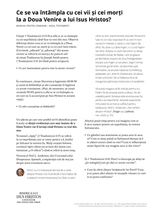 Ce întrebări sau gânduri îți vin în minte când te gândești la a Doua Venire a lui Isus Hristos? În prima sa epistolă către tesaloniceni, capitolele 4-5, apostolul Pavel ne-a învățat detalii importante despre a Doua Venire a Salvatorului și cum putem fi pregătiți pentru ea. Această lecție este menită să te ajute să înțelegi ce se va întâmpla și cum te poți pregăti pentru momentul în care Isus Hristos Se va întoarce pe pământ.