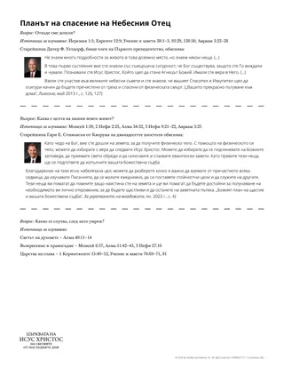В доземното ни съществуване сме „възклицава(ли) от радост“ (Йов 38:7), когато сме научили за плана на Небесния Отец за нашия вечен напредък. Йехова е избран да бъде наш Спасител и Изкупител, осигурявайки ни начин да се завърнем при Отца и да станем като Него. Този урок може да помогне на учениците да разберат плана на спасение на Небесния Отец и централната роля на Исус Христос.