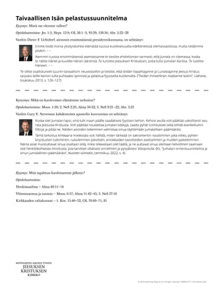 Jos oppilaat tarvitsevat lisäopastusta, voisit antaa heille monisteen ”Taivaallisen Isän pelastussuunnitelma”. Voisit pyytää oppilaita tutkimaan monistetta itsenäisesti tai pienryhmissä. Voisit esimerkiksi leikata monisteen kolmeen osaan ja laittaa osat eri puolille huonetta. Oppilaat voisivat tutkia pelastussuunnitelmaa kiertämällä paikasta toiseen yksin tai ryhmissä.
