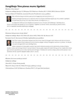 Jei mokiniams reikia papildomos pagalbos, galite pateikti jiems dalijamosios medžiagos „Dangiškojo Tėvo išgelbėjimo planas“ kopiją. Galite pasiūlyti studijuoti dalijamąją medžiagą savarankiškai arba mažose grupėse. Vienas iš būdų tai padaryti yra sukarpyti dalijamąją medžiagą į tris dalis ir padėti jas skirtingose klasės vietose. Studijuodami išgelbėjimo planą, mokiniai gali eiti nuo vienos vietos prie kitos atskirai arba su savo grupe.