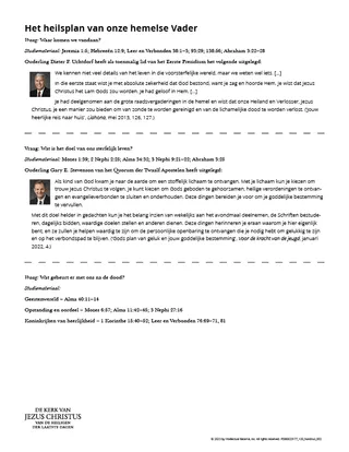 In ons voorsterfelijk bestaan juichten we van vreugde (zie Job 38:7) toen we hoorden over het plan van onze hemelse Vader voor onze eeuwige vooruitgang. Jehova werd gekozen om onze Heiland en Verlosser te zijn, en verschaft ons de weg om bij de Vader terug te keren en te worden zoals Hij is. Deze les kan de cursisten begrip bijbrengen van het heilsplan van onze hemelse Vader en de centrale rol van Jezus Christus.