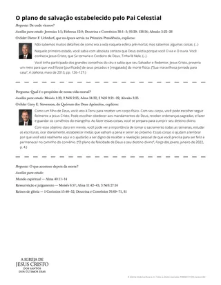 Preparação dos alunos: Peça aos alunos que ponderem o que sabem sobre o plano de salvação estabelecido pelo Pai Celestial e o papel central do Salvador em nosso progresso eterno. Os alunos podem escrever elementos do plano de salvação com os quais estão familiarizados e praticar explicando-os a um membro da família ou amigo.