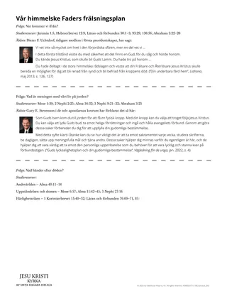 Om eleverna behöver ytterligare vägledning kan du ge dem ett exemplar av utdelningsbladet ”Vår himmelske Faders frälsningsplan”. Be dem gärna studera utdelningsbladet på egen hand eller i små grupper. Ett sätt att göra det är att klippa utdelningsbladet i tre delar och placera delarna här och var i rummet. Eleverna kan rotera mellan platserna i rummet var för sig eller med sina grupper när de studerar frälsningsplanen.