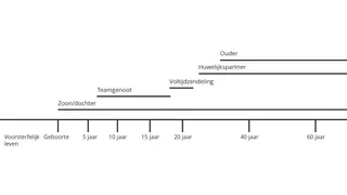 Teken een horizontale lijn die je leven voorstelt en benoem die met de verschillende identiteiten of titels die je in het verleden hebt gehad, nu hebt of in de toekomst verwacht te hebben. Denk bijvoorbeeld aan ‘vriend(in)’, ‘leerling’, een functie op je werk of je roeping in de kerk. Hieronder staat een voorbeeld: