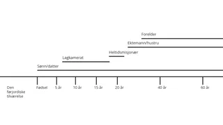 Tegn en vannrett linje som forestiller livet ditt, og merk den med forskjellige identiteter eller titler du har hatt tidligere, for tiden har, eller forventer å ha i fremtiden. Dette kan være “venn”, “elev” eller en stillingstittel eller et kall du har hatt. Her er et eksempel: