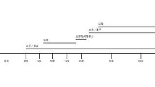 画一条横线来代表你的人生,在上面标示出你在过去曾拥有、现在正拥有,或是未来预期会拥有的各种身份或称谓。这可以包括「朋友」、「学生」,或是你曾有过的职务或称呼。以下是范例: