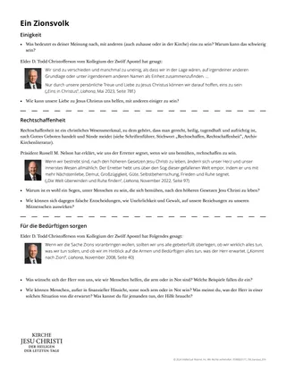 Um die christlichen Eigenschaften Zions anhand eines Beispiels zu veranschaulichen, könnten Sie das Video „Nächstenliebe: Den Gläubigen ein Vorbild“ (4:50) zeigen, das im Archiv Kirchenliteratur zu finden ist. Bitten Sie die Schüler gegebenenfalls, darauf zu achten, wie die Jungen Damen in dem Video die Eigenschaften Zions vorgelebt haben.