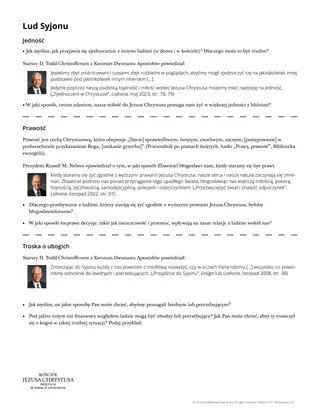 Pomóż uczniom rozpoznać następującą prawdę: Lud Pana stara się być zjednoczony, żyć w prawości i troszczyć się o biednych pośród nich. Możesz zwrócić uwagę uczniów, że są to również cechy Zbawiciela. Stawanie się ludem Pana oznacza stawanie się bardziej podobnym do Niego.