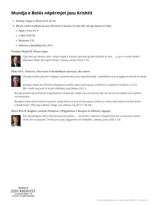Për t’i ndihmuar nxënësit të zbulojnë mënyra se si mund ta ndjekin Shpëtimtarin në një botë të ligë, jepuni atyre udhëzimet më poshtë dhe kopje të fletushkës shoqëruese. Nxënësit mund të punojnë në grupe. Ata mund t’i studiojnë burimet së bashku, ose anëtarët e grupit mund të përzgjedhin fragmente të ndryshme të shkrimeve të shenjta dhe thënie për t’i studiuar më vete dhe më pas të mblidhen bashkë për t’i diskutuar.
