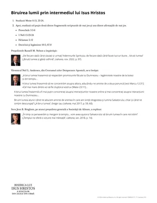 Pregătirea cursanților. Invitați cursanții să se gândească la încercările sau dificultățile cu care se confruntă în a-L urma pe Isus Hristos în lumea de astăzi. Rugați-i să vină la lecție pregătiți să împărtășească ce i-a ajutat să biruiască lumea și să-L urmeze pe Isus Hristos.
