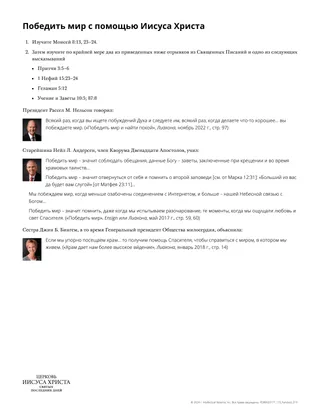 Благодаря тому, что Иисус Христос победил этот падший мир и благодаря тому, что Он искупил каждого из нас, вы тоже можете победить этот насыщенный грехом, эгоцентричный, а часто и отнимающий силы мир. («Победить мир и найти покой», Лиахона, ноябрь 2022 г., стр. 96)