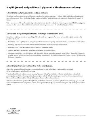 Tato část lekce poskytuje studentům ve třídě čas na to, aby něco udělali pro naplnění svých zodpovědností vyplývajících z Abrahamovy smlouvy. Na základě následujícího handoutu byste mohli vytvořit výuková stanoviště. Studenti by si mohli vybrat jednu činnost, na kterou se zaměří, nebo střídat různé činnosti. U jednotlivých stanovišť byste mohli pověřit vedoucí z řad studentů, aby svým vrstevníkům pomohli dané činnosti vypracovat. Vyzvěte studenty, aby při výběru toho, na co se zaměří, usilovali o inspiraci.