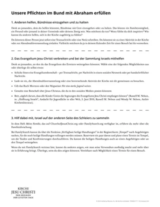 In diesem Teil der Lektion haben die Schüler Zeit, etwas zu tun, womit sie ihre Aufgaben im Bund mit Abraham erfüllen. Anhand des folgenden Arbeitsblatts können Sie Lernstationen einrichten. Die Schüler können entweder eine Aufgabe auswählen, auf die sie sich ausschließlich konzentrieren, oder sie können zwischen verschiedenen Aufgaben wechseln. Sie können für jede Station Leiter aus den Reihen der Schüler festlegen und sie beauftragen, den anderen bei der Bearbeitung der Aufgabe zu helfen. Fordern Sie die Schüler auf, sich bei der Entscheidung, worauf sie sich konzentrieren möchten, um Inspiration zu bemühen.