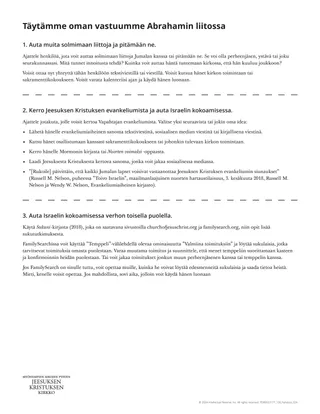 Oppiaiheen tässä osuudessa oppilaat saavat oppitunnilla aikaa tehdä jotakin täyttääkseen vastuitaan Abrahamin liitossa. Voisit seuraavan monisteen pohjalta perustaa oppimispisteitä. Oppilaat voisivat valita yhden tehtävän, johon keskittyä, tai he voisivat kiertää pisteeltä toiselle. Voisit nimetä oppilaiden joukosta kullekin pisteelle vetäjän, joka auttaa muita tehtävien tekemisessä. Kehota oppilaita tavoittelemaan innoitusta, kun he valitsevat, mihin keskittyä.